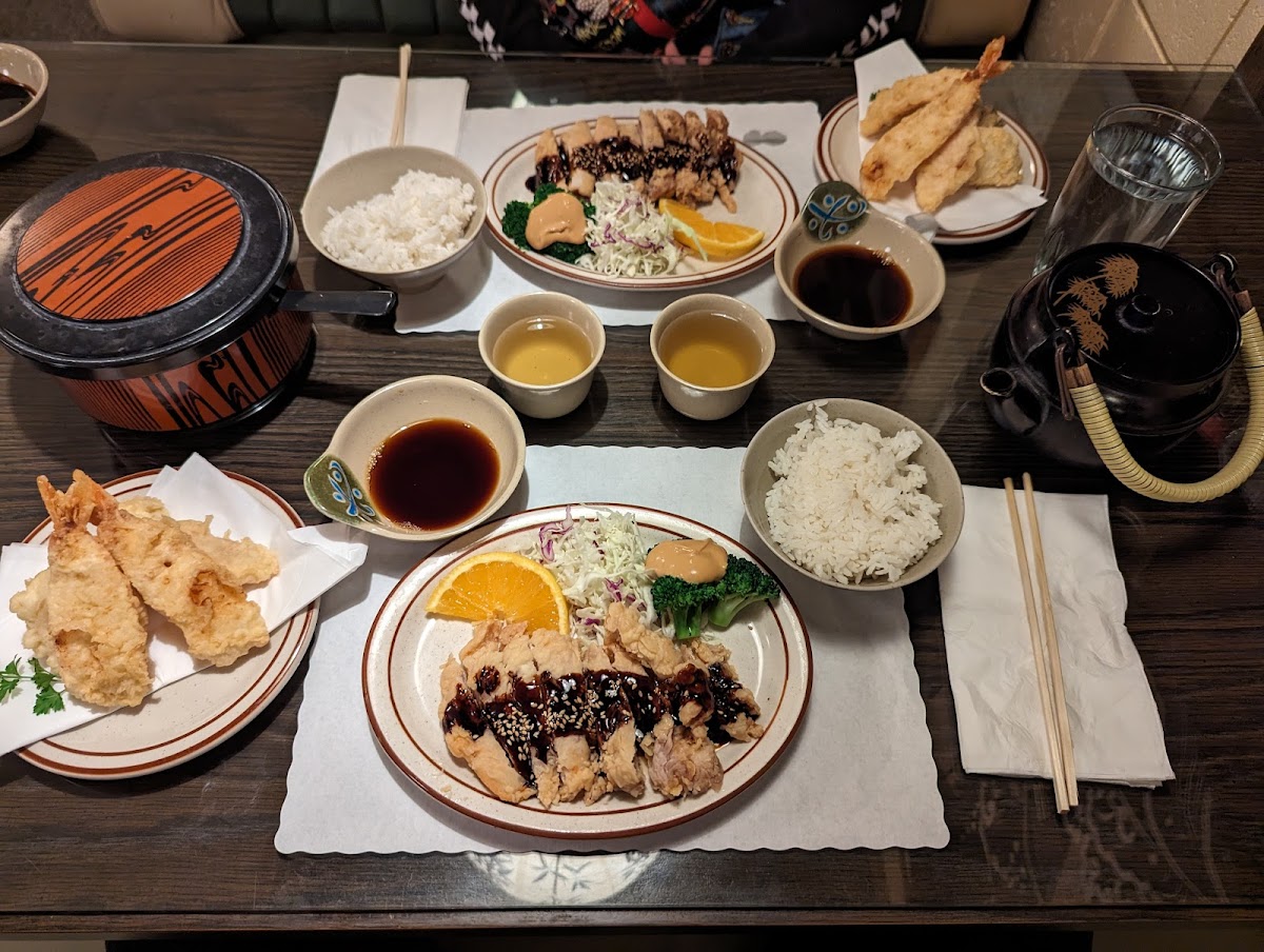 This place is a hidden gem of Merced. No sushi, but delicious Japanese food. I love the small dishes that come with the plates. Pictured are the sesame and teriyaki chicken lunch specials, an order of edamame, and some green tea. Excellent value!